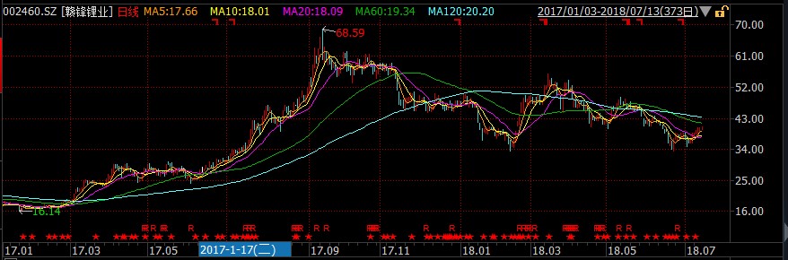 截至2018年7月30日(本周一),公司股票收盘价37.73元/股(前复权,下同),20日均价为38.20元/股。2017年1月以来,公司股价一路攀升,从年初16.14元/股到2017年7月的历史最高价68.59元/股,上半年涨幅325%,此后股价波动下跌,目前股价为近一年半的中位,近一年的低位。赣锋锂业的走势强于大盘和行业指数(金属非金属行业)。