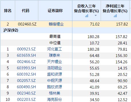 成长能力:从收入、利润的增长速度来看,赣锋锂业分列行业的第二和第一,业绩增长亮眼。同为行业龙头的天齐锂业,业绩同样增速较快。