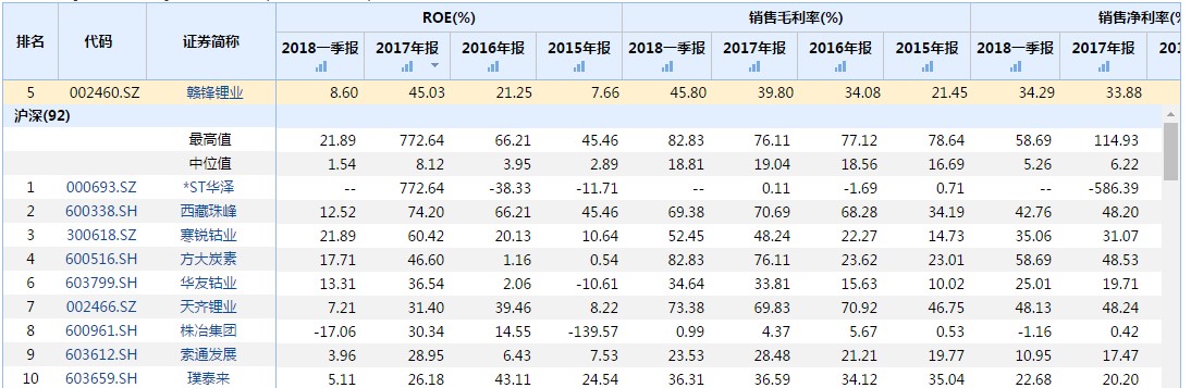 盈利能力:2017年,赣锋锂业ROE排名第5名,毛利率排名第16名,净利率排名第9名,为行业上游水平