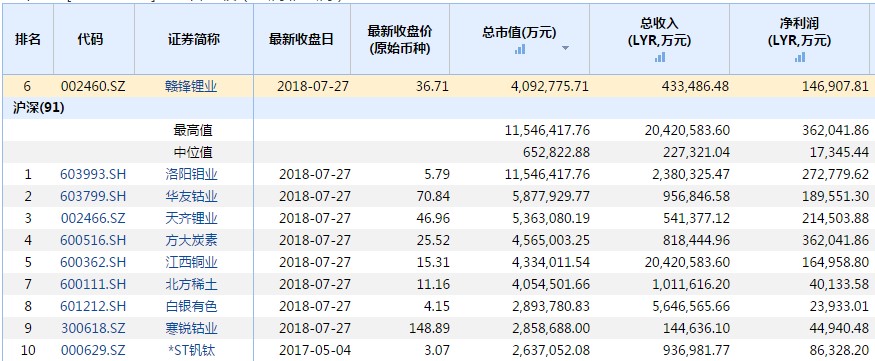 综合比较:根据wind行业分类,公司属于金属非金属行业,在A股该分类下有92家上市公司。赣锋锂业总市值排名6名,收入排名36名,净利润6名,为行业的上游水平。其中,截至2018年7月30日,同为锂化合物龙头的天齐锂业,市值是赣锋锂业的1.31倍,收入是其1.25倍,净利润是其1.46倍;赣锋锂业和天齐锂业PE(TTM)分别是24.20和22.35。