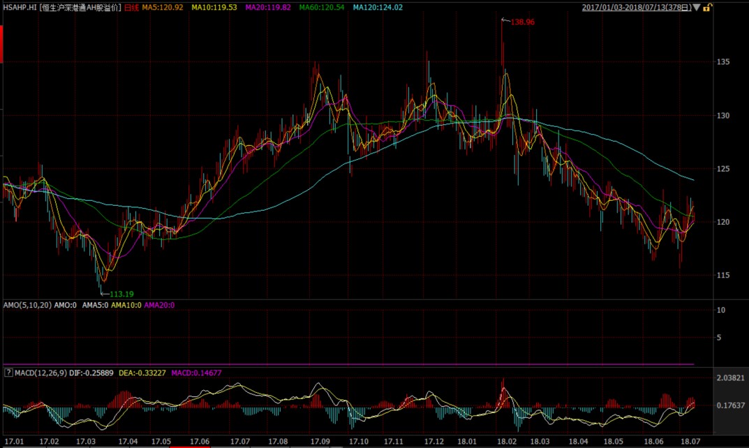 恒生沪深港通AH股溢价指数(HSAHP):该指数代表了A+H股上市公司的A/H溢价率*100的数值,近52周的最高点为138.96,最低点为113.19,截止2018年7月30日的前20日均值为119.30。