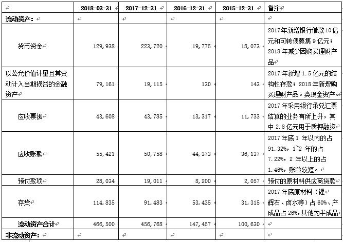 截至2017年底,公司资产以流动资产为主,占57%。主要包括货币资金及类现金金融资产24亿元、存货9亿元、参股股权(可供+长投)14亿元、固定资产8亿元、在建工程7.6亿元应收账款。现金较为充足,参股公司主要为上游锂资源公司,与公司所处行业、业务具有协同性;其中约4.8亿元为持有在加拿大、澳洲上市公司权益,流动性尚可。资产质量尚可。