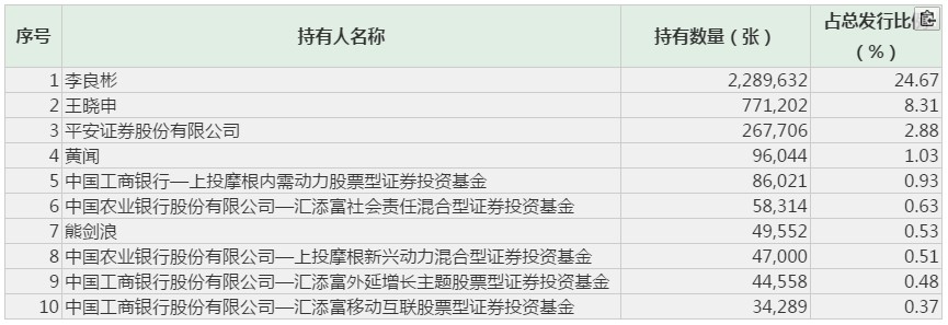 发行情况:公司2017年12月公开发行928万张可转债,原股东配售497万张,占54%;社会公众认购405张,占43%;保荐人包销26万张,占3%。2018年6月公司实际控制人李良彬减持其中的104万张,减持后仍持有全部可转债的13.43%。其他前十名可转债持有人情况如下图所示: