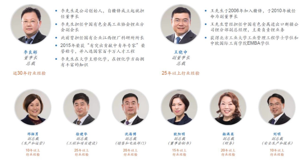 公司主要高管较为稳定,加入公司时间均在10年以上,具有较丰富的有色金属行业的相关从业经验。其中公司董事会主席兼总裁李良彬先生技术出身,于锂行业拥有近30年的经验,董事会副主席兼副总裁王晓申先生于锂产品销售及营销方面拥有逾25年的经验。公司董事及高管层持有公司约35.1%的股份,339名主要技术及管理骨干员工通过股权激励计划认购了公司的限制性股票。