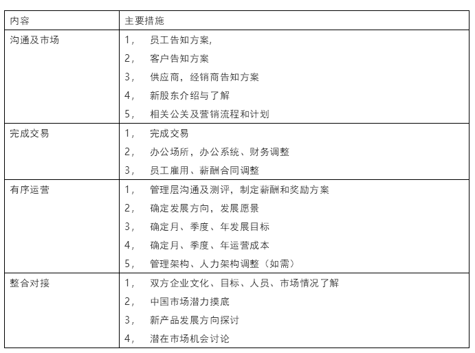 投后100天的安排对于被收购企业的顺利承接,以及顺利实施下一步的中长期方案起着至关重要的定调作用。应利用这100天的机会,完成收购后的转接,了解公司人员,运营等情况,同时确保公司在交接中仍有序运转,不对销售和市场产生负面影响。具体安排如下表:
