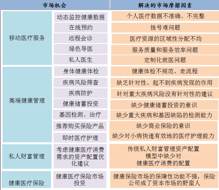 医疗健康服务供给端投资机会有两个主要发力点:高端健康管理与移动医疗服务(MobileHealth)。类似于北京e医生这样的第三方专业机构可以在健康管理、精准医疗、智慧公卫等方面,从身体健康体检、疾病风险筛查、提前预警、疾病防护、精准医疗方面提供高效率的服务,能够使消费者更准确地研判其对于健康储蓄投资或者投资购买保险产品的需求,提高其医疗健康的保障水平。