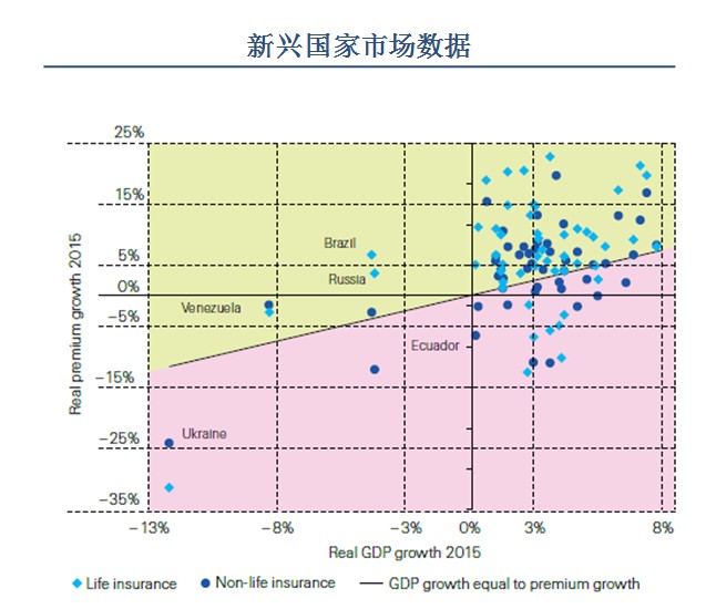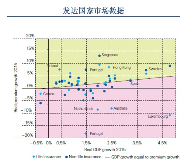 从瑞士再保险的经验数据(如下图),发达国家的保费增长率总体来看与GDP增长率持平,新兴市场国家的保费增长率总体来看2倍于GDP的增速,就各国指标来看,寿险及健康险业务保费增长率相对于GDP增长率的敏感度相对比较增速更高,这与新兴市场国家的人口增长、保费渗透率有关。因此,建立针对健康医疗的消费者保险模型,通过差异化的定价模型和保险产品投放,使保险产品回归保障人们健康的本质,将会在快速增长的健康医疗保险市场获得核心竞争地位。