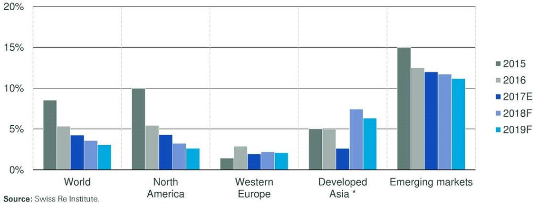 1. 在健康医疗保险投资方面,从全球来看,人们医疗费用支出随收入增加以及人口结构的变化而增加,对健康更加重视成为支持医疗健康保险市场发展的强大动力,消费者对健康和医疗资源的消费需求可以通过健康储蓄投资或者投资购买保险产品的方式进行满足。通过瑞士再保险(Swiss Re)的数据可以看到,2017年寿险业务下医疗保险板块保费增长达4%左右,预期未来西欧地区保费增长率2%,亚洲发达地区约在6%左右,新兴亚洲市场将超过10%的增长速度。