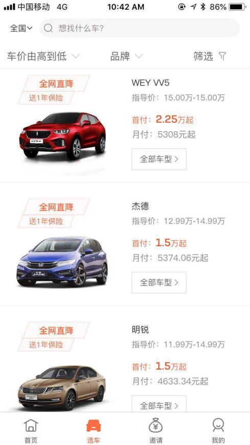 大白汽车的市场定位是“年轻人的第一辆车”,下载大白汽车app,可以发现大白汽车的绝大部分车型价格在15万以内,属于中低端车型,首付大部分在2万以内,车贷分期一般在36个月。利润主要来自于车辆价差(销售价格和批发价格差)和利息收入。