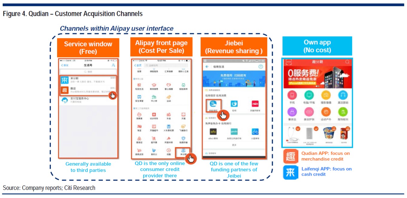 趣店的获客能力如此突出,与得到阿里系的投资密不可分。依托于蚂蚁金服构建的覆盖理财、征信、保险、信贷、银行等产品类型的金融服务体系,支付宝能够低成本汇聚大量的优质客户,2017年9月支付宝月活数超过4亿。支付宝专门为趣店开放了首页、服务窗口、借呗融资伙伴等独特入口,直接将其海量的优质客户资源导向趣店。
