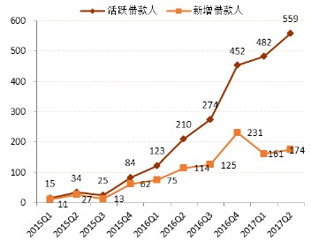 相比其他消费金融平台,趣店背靠蚂蚁金服,获客成本较低且获客策略富有成效,受益于此,趣店用户规模快速扩张,建立起庞大用户基数。流量带来了经营规模效应优势。截止2017年中,趣店累计注册用户数达到4,790万,较2016 年底增长41%。2Q17 注册用户中仅有37%(约1,760万人)已经获得趣店提供的信贷额度,仅12%(560 万人)实际发生贷款,注册用户向贷款用户的转化率仍有提升空间。