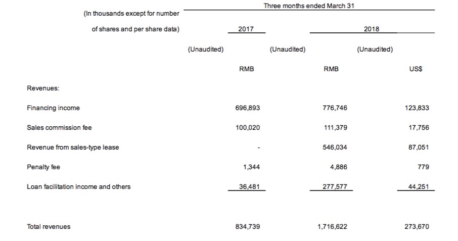 2018年1月,趣店宣布汽车金融租赁产品大白汽车上线。在5月底宣布的未经审计的财务数据里,销售型租赁收入迅速提升。1季度,趣店销售型租赁收入5.46亿人民币,超过销售佣金和借贷撮合收入,成为第二大收入来源。