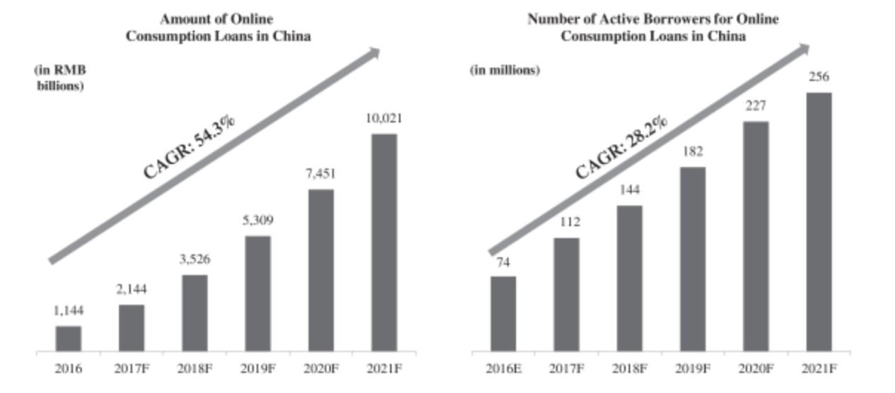 中国日益增长的消费驱动型经济已经对消费金融产生了巨大的需求。传统的银行系统主要服务于在央行有征信档案的消费者。根据招股书指出,2016年中国18-35岁的消费约为3.67亿,他们构成了互联网消费金融市场的核心目标群体,他们大部分都是活跃的购买力,只是财富和信贷资料都还在逐渐积累的过程。2016年,中国20-24岁、25-29岁和30-34岁的消费者的平均月消费约为835元。这些群体当中的借款人,大部分具有良好的信用,受限于目前的财务状况、征信档案,很难获得传统金融机构的资金解决方案,但这为创新的消费金融产品创造了大量机会。在移动app激增的背景下,互联网消费金融服务提供商们为借款人提供便捷的借贷服务,这对于普通的借款者有着巨大的吸引力。