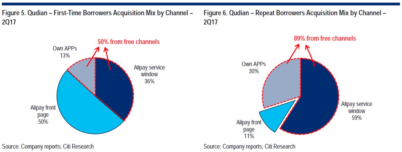 趣店在2015年全面转型线上后用户数的爆发式增长,以及其在小额在线消费信贷中独特且难以被取代的竞争优势,很大程度上得益于其与蚂蚁金服(支付宝)的战略合作关系。实际上,与蚂蚁金服的合作——通过支付宝的服务号、首页来分期的一级推广入口、以及高频使用的蚂蚁借呗,为其带来了远超同行的用户增长:总注册用户从15年第四季度的800万,快速增长至2017年第三季度的5600万,这期间的总活跃借款人数更是翻了10倍达到1300万。并且,其通过支付宝的获客成本远低于其他金融科技平台:趣店的获客成本占其借款总额的0.56%,而宜人贷的获客成本占借款总额的比例是趣店的十倍有余。50%的首次借款人来自于免费的渠道(如下图,13%来自于自有APP,36%来自于支付宝服务号),更是有89%的重复借款人来自于免费渠道(30%自有APP,59%来自于支付宝服务号)。活跃用户持续且低成本的爆发构成了其他金融科技平台进入该细分领域的门槛之一。