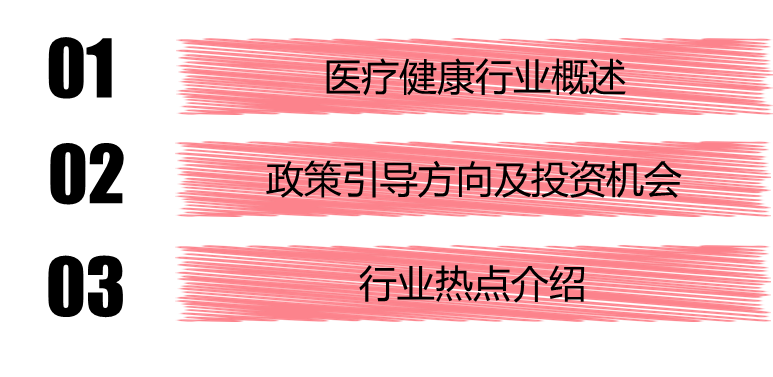 今天的分享有三个部分,首先我想跟大家简单介绍一下医疗健康这个行业的情况以及我们观察到的投资和退出的趋势,给大家一个概念;而后,我会介绍一下目前我国医疗健康产业相关政策的目标的具体指引措施;最后,简单说一下最近几个比较热点领域的发展情况。