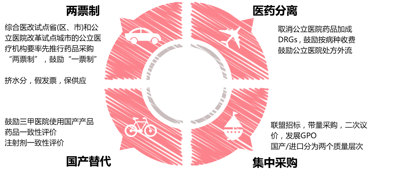 第一,为了解决我国社保资金合理使用问题,避免人为造成社保资金的不必要支出。解决这个问题,国家出台了两个方向的政策,一是如何能让药品、高值耗材等会造成较大规模社保资金消耗的产品单价降下来。从降单价来看,国家陆续出台了“两票制”政策,旨在通过减少中间流通环节来降低终端药品价格,实现对药品流通信息的全面深入监管,并通过发展集中采购的方式以量换价,例如深圳、杭州等个别地区积极探索发展GPO(编者注:Group Purchasing Organizations 意思是药品集中采购组织)等模式,希望能通过联盟采购的方法来降低产品单价。