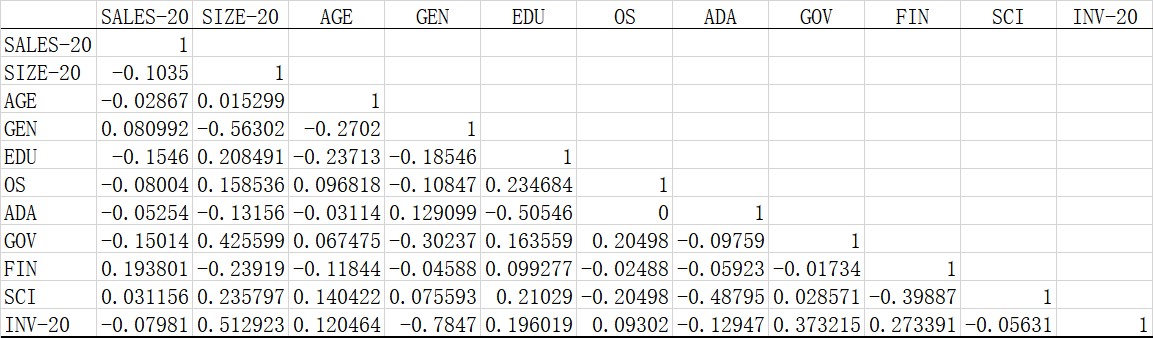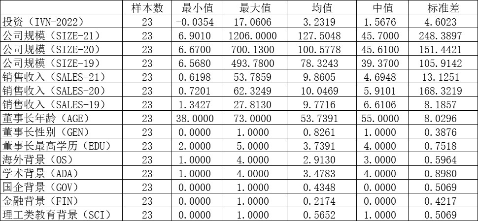 本文的样本观测值为2019年-2021年上市公司中ETC相关行业的上市公司数据,共计23个样本观测值。本文主要研究的是在ETC细分行业内,因政策红利而使得公司营收、规模和现金扩大和增加后,董事长在做对外投资时个人风格的影响程度的研究分析,由于行业原因故在Wind上给定的ETC行业上市公司样本观测值相对较少。样本的所有财务数据、公司治理数据、董事长各项个人特征等均来自Wind数据库。