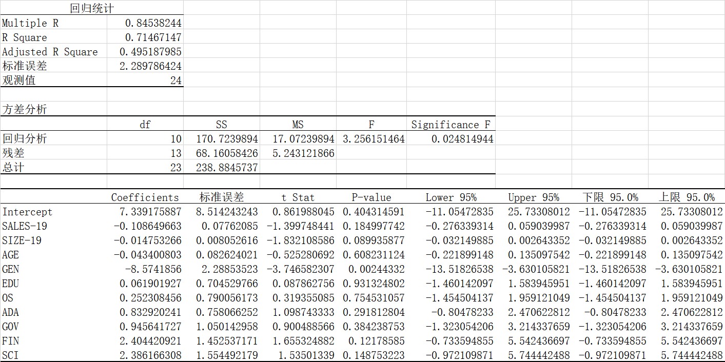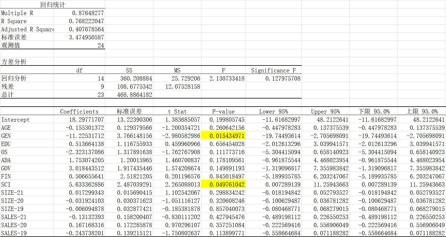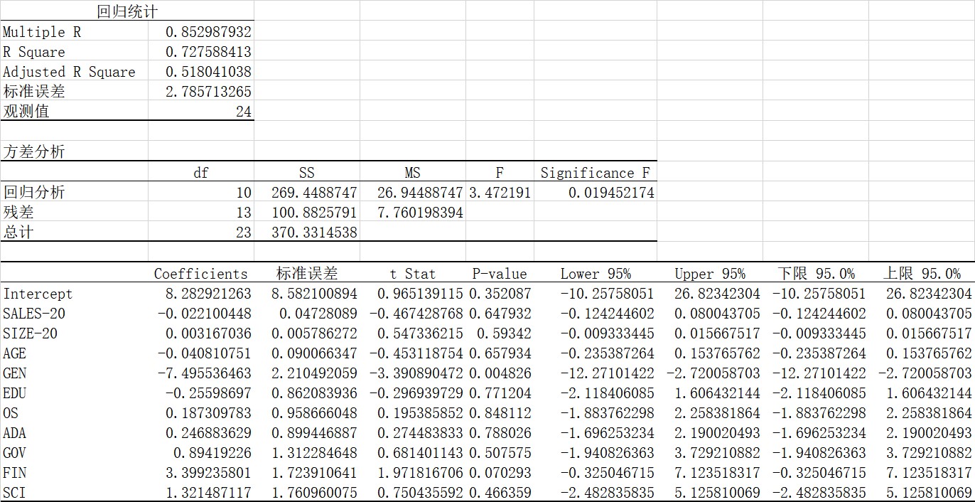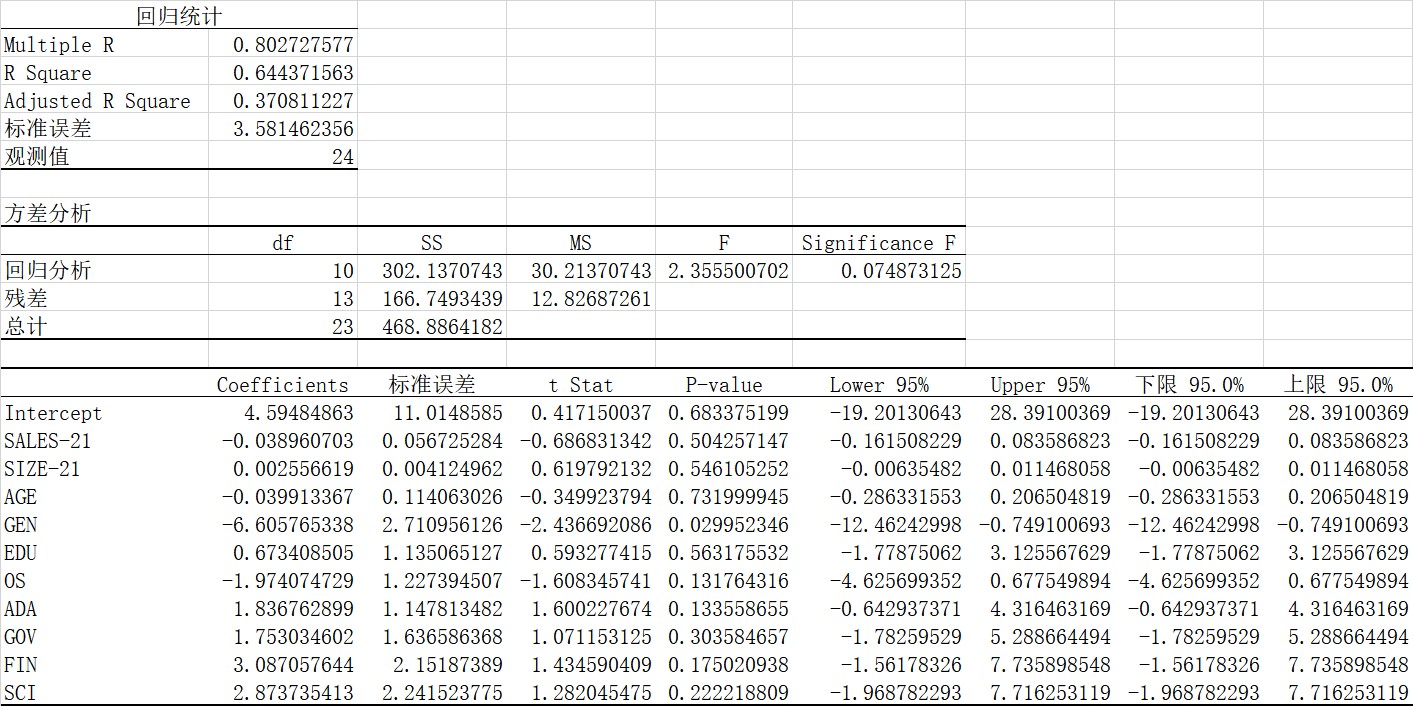 从表6-表9中可以看出,R2在2019年-2021年回归分析中的值分别为71%、72%、64%,调整R2在2019年-2021年回归分析中的值分别为50%、52%、37%。对于样本观测值的回归拟合度在2021年数据一般,2019年和2020年的拟合度良好。从表9中通过对2019年-2021年三年综合数据对2021年投资的回归分析可得,R2值为77%,拟合度提高幅度上升。