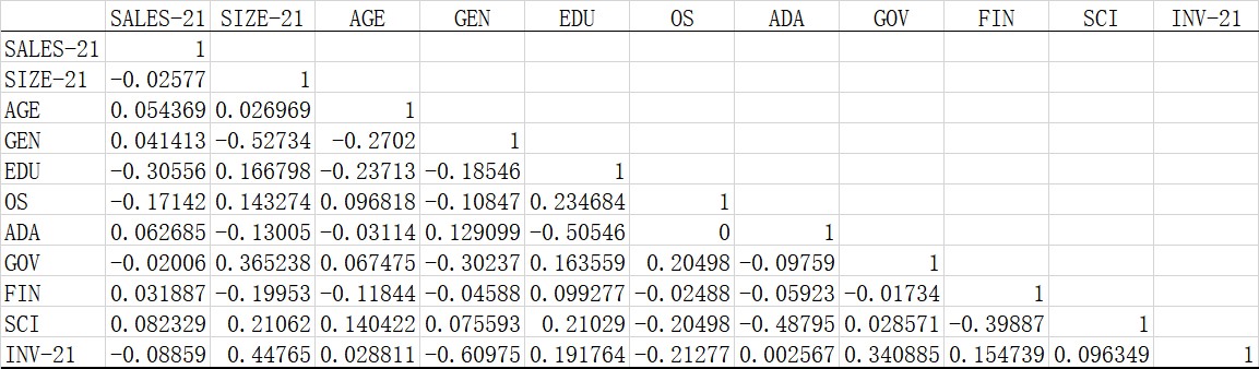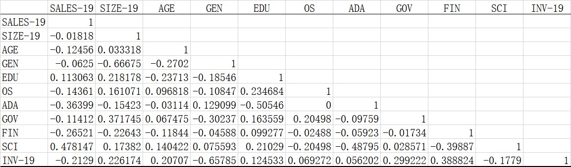 表3-表5列出了各变量在2019年-2021年内的相关性,解释变量的相关性均在0.5以下,说明在计量模型中能较好的避免变量之间的多重共线性。