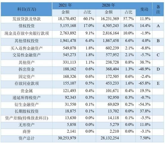 截止2021年底,建设银行发放贷款和垫款比上年增加1.94万亿,提升11.9%;金融投资(含债权投资A、其他债权投资B、交易性金融资产C)同比新增6,912.66亿,提升9.95个百分点。 由于这两类资产增长的驱动,本年度建设银行资产总额较上年增加2.12万亿,达到30.25万亿,同比提升7.5个百分点。