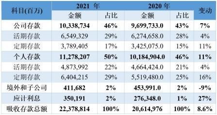 表4 建设银行2021年和2020年吸收存款细分数据对比