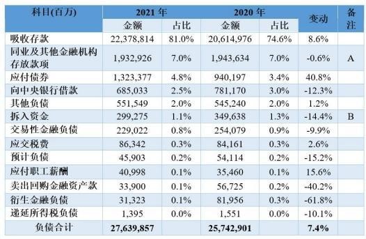 2021年末,建设银行负债总额27.6万亿,较上年增加1.9万亿,增幅7.4%。其负债新增主要来源于两个驱动因素,即吸收存款和应付债券。其中,吸收存款新余额1.76万亿,增幅达8.6%;应付债券新增0.38万亿,增幅40.8%。