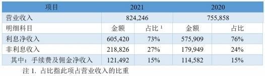 银行的营业收入主要来源于利息净收入 (利息收入-利息支出) 、手续费及佣金净收入和投资收益等其它收入,其中利息净收入仍占重要地位。2021年,利息净收入占总营业收入的73%,手续费及佣金净收入占15%,与2020年相比基本保持一致。在利息净收入中,公司类贷款和垫款、个人类贷款和 垫款和投资性债券占比较大。在利息支出明细中,我们可以看到将近80%的利息支出来源于个人类吸收存款利息和公司类吸收存款利息,两者合计占79%。在手续费和佣金业务方面,主要收入来源于电子银行业务 (21%) 、其次分别是银行卡手续费、代理业务手续费、理财产品业务收入和托管业务佣金等。其中代理业务、理财产品和托管业务相比2020年有一定增长。