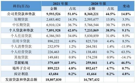 表2 建设银行2021年和2020年发放贷款和垫款总额细分项数
