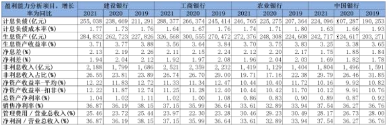存款是四大行最大的负债构成,建设银行的存款总额在近三年均位居四大行第二,近两年的存款总额增长率占据榜首,且在2020年领先工商银行2.86个百分点,2021年更是高出3.36个百分点,说明其在经营效率和效果方面有了比较大的优势。