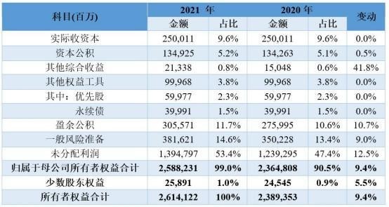 表5是两年度建行的所有者权益情况,可以看出2021年末,建行股东权益较同期增幅9.4%,主要是由于未分配利润、盈余公积和一般风险准备新增导致。