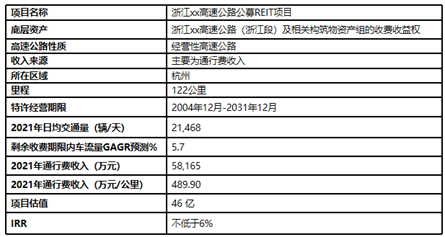 本基础设施项目底层资产为浙江某高速公路(浙江段)全长122公里的高速公路及相关构筑物资产组的收费收益权。权利到期后,按协议将项目移交政府,若未及时扩募新项目,基金净值将减至0,基金将于存续期限前终止。