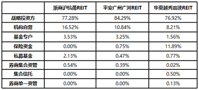 公募REITs投资人为战略投资者(占69.82%)、网下投资者(占22.71%)和公众投资者(占9.09%)。网下机构投资者中券商自营和保险资管认购较积极。券商自营占浙商沪杭甬REIT、平安广州广河REIT、华夏越秀REIT配售金额的16.5%、10.8%、8.2%。