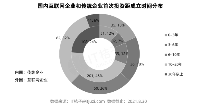 图5 中国互联网和传统企业首次投资时间距成立时间分布(图片来源:IT 桔子)