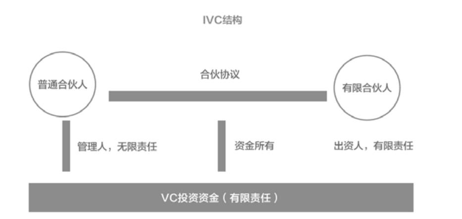 独立风险投资(Independent Venture Capital,缩写为IVC)是传统的风险投资(Venture Capital,简称VC)的一种形式,也被称为创业投资。为了与后来兴起的企业风险投资(Corporate Venture Capital,简称CVC)进行区别,它被称为独立风险投资(IVC)。IVC是一种专门从事投资的金融机构,主要业务是为创业企业提供资金,以获得一定比例的股权,并通过创业企业的IPO上市或并购等方式退出获取高额的投资回报。IVC机构的资金主要来自金融机构投资者和高净值人群等。通过对创业企业进行尽调,筛选出有发展潜力的公司进行投资,其最终目标是在考虑时间和资金成本的情况下,获得最大化的财务回报。一般而言,IVC的组织结构由普通合伙人(General Partner,简称GP)和有限合伙人(Limited Partner,简称LP)组成,有限合伙人会提供资金并承担有限责任,而普通合伙人则通常负责管理并承担无限责任[1]。如下图所示。