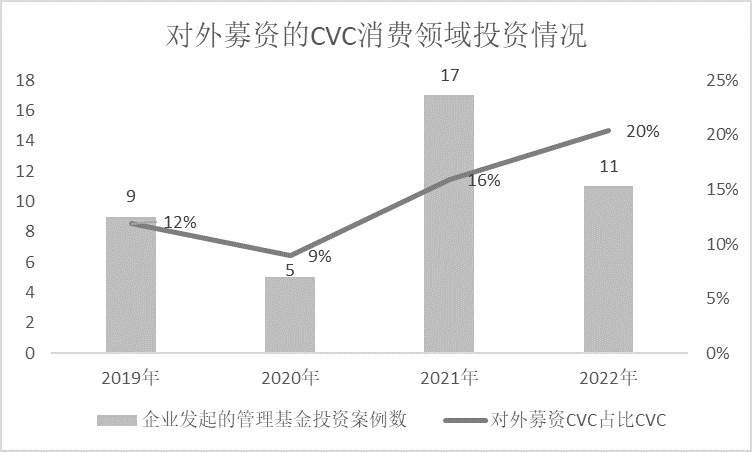 CVC 正在演变成两种形式:一是持续保持内部运作,成为企业内部战略投资部;二是逐步 VC 化,即向独立的风险投资机构发展。CVC 的 VC 化具体表现形式包括独立于母体、采用全新的品牌名称,以及更重要的标准是开启独立的对外募资——不仅有自身企业作为基石投资人,还有能力发展外部 LP,管理更多的外部的资金。图6显示了对外募资的CVC在消费领域投资案例占CVC比例在近两年逐年提升,从2020年9%上升至2022年20%,也证明了CVC在逐渐VC化和市场化的趋势。传统内部化运作下,CVC整体的战略和决策完全依附于母公司,而当母公司业务出现危机后,企业投资的业务将不得不收缩,且在人员的激励上要逊于市场化的机构,因此越来越多的CVC开始走向VC化,开始独立募资和投资项目,在一定程度下能够抵御依赖单一LP(母公司)下的风险。