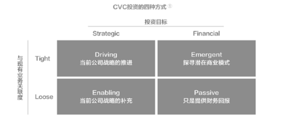 CVC又根据被投公司和母公司的业务相关性和投资目的分为以下四类,驱动投资(driving investment)的特点在于被投公司和CVC母公司主营业务有强相关性,在业务上和母公司上可以互相赋能。补充投资(enabling investment)具有创业企业主营业务能够为CVC母公司构建相关产品生态的特征,以补充战略布局使CVC企业增强竞争力与客户粘性。期权投资(emergent investment)具有被投资公司与母公司之间业务重合度较低的特点,它不仅追求财务回报,还被用于探索潜在商业模式,并为母公司今后商业转型做好准备。被动投资(passive investment)具有被投资公司与母公司业务没有重合度、仅仅用于追求财务回报等特征。