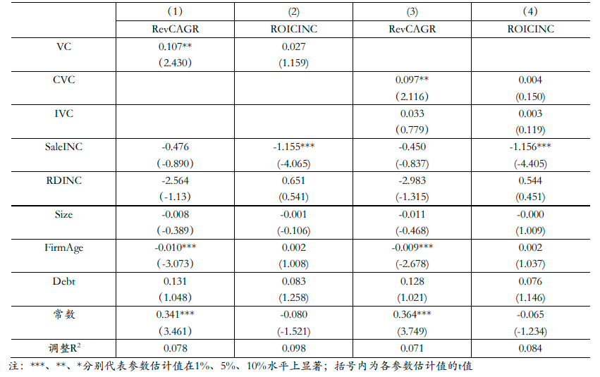 如下表为回归分析的结果。为了检验假设一,以上市前三年的营收复合增长率作为因变量,上市前是否有风险投资机构参与作为自变量进行回归,可以看出(1)的VC系数显著为正,因此该假设成立。在(2)中,VC系数不显著,因此我们不能得出风险投资机构的参与能够提升企业的资本回报率的结论;在(3)中,CVC的系数显著,而IVC的系数不显著,因此假设三成立,CVC的参与相比IVC的确能够在显著提升企业营收;在(4)中,CVC和IVC的系数均不显著,因此假设四不成立。