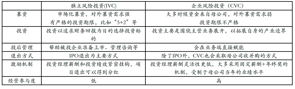 CVC与IVC最明显的区别是其有产业资源,所投的资金绝大部分来自于集团公司(投资由战略投资部门承担)或母公司(投资由新设子公司独立承担)的自有资金。基于此,CVC机构与IVC在募投管退各个环节有着显著的差异。