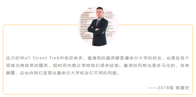 在本次Wall Street Trek中,Rob Symington、Jim Kester、Barry Wintner、Paul Robertson、Katherine Feld、Jim Hudak、Mark Brennan共七位拥有多年华尔街实战经验的康奈尔大学校友担任分享嘉宾。他们从各自的工作领域出发,结合生动的案例和个人收获,向金融MBA2018级的同学们分享了自己的金融从业及投资经验。