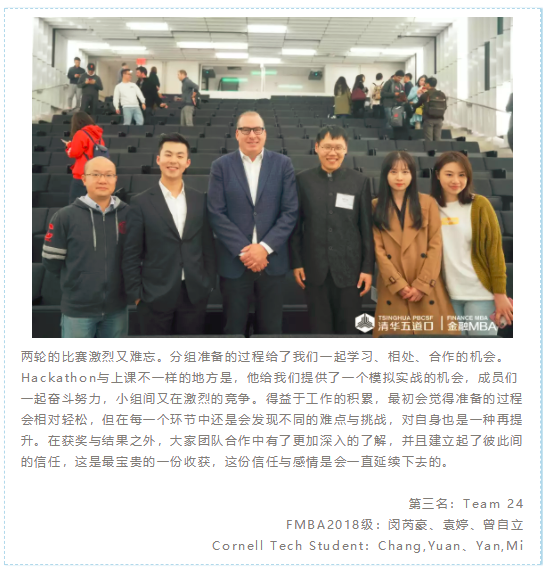 纽约东部时间4月27日,在结束了Wall Street Trek模块的学习后,同学们迎来了本次赴美学习中的另一项重要日程——2019 Hackathon竞赛。Hackathon作为康奈尔大学约翰逊管理学院一项传统的创新实践大赛,已经连续举办多年,从清华-康奈尔双学位金融MBA项目首期班赴美学习开始,它已成为广大师生期待的亮点,也成为约翰逊管理学院跨项目学习、融合、实践创新的一个典范。