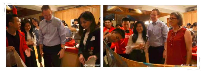 同学们也为Mark院长及其夫人精心准备了礼物,老师和同学们一起合唱校歌、打乒乓球、在庭院散步,在Mark院长家、在伊萨卡美丽的星空下,师生间进行了愉快而深入的交流,度过了难忘而美好的夜晚。